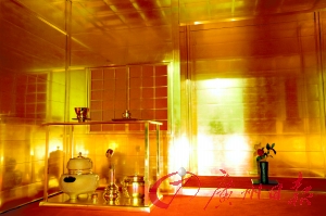 該茶室長2.7米,寬2.55米,高2.5米。由日本長野一家公司以日本戰(zhàn)國時代末期封建領(lǐng)主豐臣秀吉1587年修建的黃金茶室為原型,1比1復(fù)制而成。