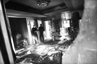昨日上午9時30分許,記者在火災(zāi)現(xiàn)場看到,房屋客廳內(nèi)一片狼籍,地板、沙發(fā)、電視機等都被燒毀,窗戶被撬開,墻壁都被熏黑了,門前有一個使用過的滅火器。 民警、消防人員正在勘查現(xiàn)場。
