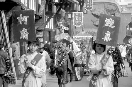 上午9時(shí)許,在震天的鑼鼓聲中,33歲的新郎Nicholas(中文名柯家樺)騎著一匹高頭大馬,帶著迎親隊(duì)伍由資中鼓樓壩廣場出發(fā),浩浩蕩蕩地前往當(dāng)?shù)赜忻奈幕袍E文廟。馬背上的新郎羽扇綸巾,而新娘則端坐在花轎中,前有“媒婆”和“丫鬟”帶路。縣城少有如此特殊的迎親隊(duì)伍,加之新郎是一個(gè)膚色白皙的老外,沿途引得不少群眾駐足。
