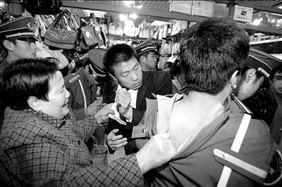 因售假受到封攤處罰,秀水街市場(chǎng)攤主與管理方的矛盾愈演愈烈。15日,秀水街市場(chǎng)對(duì)第三批8個(gè)被控售假的商戶進(jìn)行封攤處理。其間,封攤?cè)藛T遇到了攤主及其“親友團(tuán)”的殊死抵抗;一老太太還在地上打滾,堅(jiān)決不讓保安靠近自己兒子的攤位。