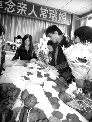 昨天上午9時許,八寶山殯儀館百合廳門前聚集著許多手持菊花的人,他們都是為常瑞娟送別的。隨后,娟子的男友劉貴年帶著娟子的家人走進百合廳。他面容憔悴,嘴唇毫無血色。殯儀廳的中央,娟子靜靜地躺在那里,身穿潔白的婚紗,身上被鮮艷的紅玫瑰花瓣簇擁著!霸谒∥5臅r候,我問她還能堅持嗎?她拉著我的手,用盡全身力氣重重地點了點頭!眱x式上,劉貴年望著女友的臉述說著她的堅強,一直忍著只是哽咽的他突然發(fā)出撕心裂肺的哭聲。在他身邊,娟子的父母姐妹早已泣不成聲,在場的人無不流下眼淚。在最后對遺體告別時,劉貴年一直撫摸著娟子的臉。最后一刻,他突然低下頭,深深地吻向女友。