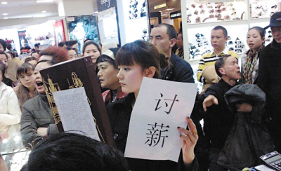 “三八”節(jié)本該是婦女的節(jié)日,然而這一天重慶解放碑鬧市某商場卻出現(xiàn)了一名漂亮女子舉紙條討薪維權(quán)的場面,驚動(dòng)了110民警。原來,這名討薪女子是廣州一家公司駐該商場的營業(yè)員,因未接待顧客被公司罰款100元,拒交后又遭到調(diào)崗處理。雙方關(guān)系“拉爆”后,遂來到商場追討千余元欠薪。昨天,經(jīng)渝中區(qū)勞動(dòng)局介入,當(dāng)事雙方已達(dá)成協(xié)議,公司方面支付了她3年多的保險(xiǎn)金,欠薪也即將支付。