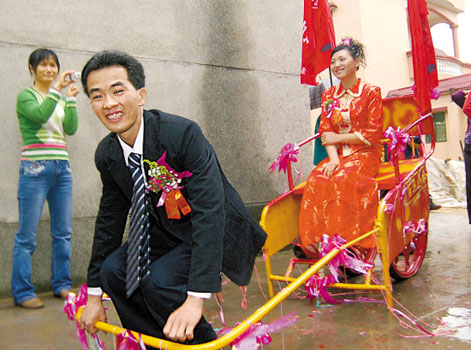當(dāng)日下午2時(shí)左右,石頭村接龍橋到慈灣村的小道上,鞭炮齊鳴,笑聲不斷。西裝革履的新郎正奮力拉著一輛自制的兩輪人力車,人力車上端坐著漂亮的新娘,紅彤彤的禮服映紅了新娘的臉。新郎是棠下鎮(zhèn)石頭村委會(huì)慈灣村人,在棠下工業(yè)區(qū)的一車廂廠工作,新娘是環(huán)市街道辦丹灶村人,兩人已經(jīng)相識(shí)一年,當(dāng)日喜結(jié)良緣。