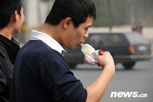 3月18日,一位身著短衫的北京市民在吃冰棒消暑。