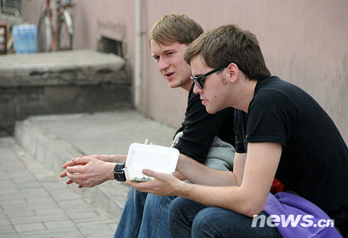 3月18日,兩位身著短衫的外國游客在一處遮擋陽光的建筑物旁小憩。