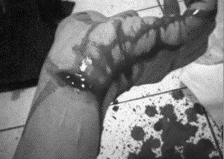 記者看到,帖子中還貼上了兩張割腕時血腥的照片,女孩被割破的左手有一道明顯的口子,依然還冒著血,而地板上一攤紅紅的鮮血看了讓人覺得不寒而栗。