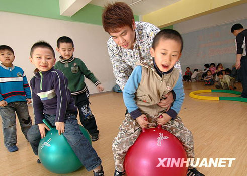 2008年畢業(yè)于遼寧省師范大學(xué)的兩位男大學(xué)生趙雷與王健應(yīng)聘到錦州市一家民辦幼兒園任幼兒教師,他們的到來為幼兒園帶來了新的教育理念,增添了堅(jiān)毅陽剛之氣,受到孩子們的喜愛,兩位“男阿姨”也漸漸地愛上了這個職業(yè)。(李鐵成 攝)