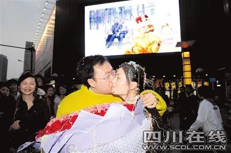 晚上7點,身穿灰色裙子的鄭小姐按照與男友的約定,準(zhǔn)點來到影城門口,突如其來的幸福把她完全驚呆了,她甚至沒來得及說一句話,只是眼里含著淚水點了點頭。求婚成功的周先生突然起身,激動地抱住女朋友擁吻,四周圍觀的人群也爆發(fā)出一陣叫好聲。