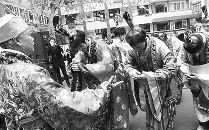 下午2點(diǎn),幽幽的古樂響起,著漢服的數(shù)位老人和18位青少年再現(xiàn)古時成人禮!罢埿泄诙Y,”在洪亮聲音下,長者們?yōu)榍嗄甏鳌肮凇辈⒄矶苏?8位青年向父母行大禮,感謝養(yǎng)育,再向師長行大禮,感謝教育。據(jù)了解,成人禮自周代就有,當(dāng)時稱為“冠笄之禮”,男孩行“冠禮”,女孩則行“笄禮”。60歲老者羅世明穿著漢服下臺來,他是行禮的長者,“現(xiàn)在年輕人似乎已忘了傳統(tǒng)道德和禮儀,希望他們從國學(xué)文化中重新了解中國傳統(tǒng)文化,端正自己!