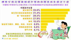 該調(diào)查顯示,33.6%的中國高中生曾“被父母打罵”,29.3%被“燙傷或燒傷”。對于父母是否有權(quán)利打罵孩子,各國高中生的態(tài)度不一。85.0%的中國高中生反對“父母打罵孩子是自家的事,別人沒有權(quán)利干預(yù)”,在四國中比例最高。