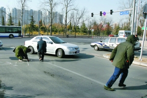 昨早8時,一輛金杯車從石景山路與上莊東街相交路口欲拐向去八寶山殯儀館西門時,突然車上撒下許多硬幣,兩位中年人跑向路口撿錢,車輛不得不暫停。當另一輛車駛?cè)氚藢毶綒泝x館西門時,再次撒硬幣,兩位老人迅速跑向車旁撿。