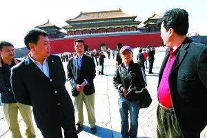 北京市旅游局副局長于德斌(左2)帶隊檢查旅游市場時,一名婦女(右2)上前向他自薦黑導(dǎo)游。昨日,北京市旅游局聯(lián)合城管、治安總隊等到故宮檢查無證導(dǎo)游帶團現(xiàn)象。由于都是便裝,執(zhí)法人員還沒走到太和殿,一名無證女導(dǎo)游就迎了上來,詢問是否需要導(dǎo)游。執(zhí)法員隨后表明身份,要求她到指定地點接受處理。本報記者 吳江 傅沙沙 攝影報道