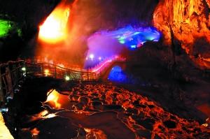 地下河景區(qū)里的云南梯田、微縮長城、洞中黃果樹等景點令人嘆為觀止。撐船在溶洞暗河里穿行,遠遠地就聽見轟隆隆的水流聲,舉目四望,卻見不到一丁點水花,拐了幾個彎之后,一簾瀑布傾瀉而下,帶來意外的驚喜。大自然以其鬼斧神工把中國自然山水與人文建筑的精華濃縮得惟妙惟肖,然后又以乾坤大挪移的手法把它們都囊括到這個溶洞之中,其中究竟,怎一個“奇”字了得?