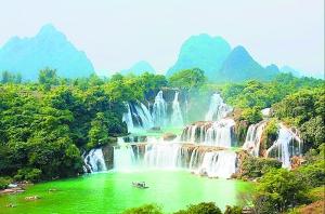 大新縣也是中越邊境縣,這里最著名的,就是中越跨國瀑布——德天瀑布。德天瀑布位于中越邊境的歸春河上游,距中越邊境53號碑約50米。清澈的歸春河是左江的支流,也是中越邊境的國界河,德天瀑布則是它流經(jīng)浦湯島時的杰作,江水從高達50余米的山崖上跌宕而下,撞在堅石上,氣勢磅礴;主體瀑布寬100米,落差70米,與越南的板約瀑布連為一體,瀑布總寬208米,是東南亞最大的天然跨國瀑布,也是世界第二大跨國瀑布。中越邊民在瀑布的下游,進行著邊貿(mào)往來,以前是肩挑人扛,現(xiàn)在已用車船運載了。