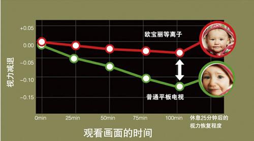 觀看100分鐘期間視力變化測試表明:長虹歐寶麗的舒適度更高,觀看期間視力下降更少,休息后視力水平更佳。(參見下圖)