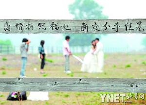 緊鄰的木柵欄上,一對新人在攝影師的指導下趴在上面拍照。不遠處另一對新人則站在了柵欄上面。盡管場地內(nèi)沒有一匹馬,而且圍欄上寫有如此的警示語,但新人們都無所顧忌地以馬場為背景拍照。有一對新人還和攝影師鉆過木柵欄,進入馬場拍攝。