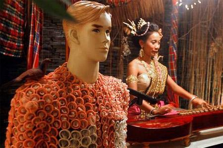 進(jìn)入餐廳的室內(nèi)區(qū),就像進(jìn)入安全套的博物館。墻壁上都是全球具有代表性的安全套產(chǎn)品的展覽,按照國別分裝在各自的格子里,不同的材料、顏色、形狀,漫步一圈能大致了解安全套的發(fā)展史。屋頂?shù)牡鯚粢惨园踩鬃鳛檠b飾,閃出不同顏色的光芒。餐桌設(shè)計(jì)也很獨(dú)特,桌面玻璃板的圖案是由安全套組合完成。靠墻的餐桌旁還能欣賞到一幅幅被“加工”過的名畫,連舉世聞名的蒙娜麗莎也客串了一回安全套的宣傳大使,手中拿著安全套沖著客人微笑。