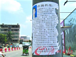 中山雅商律師事務所的律師封謨喜對記者表示,“公開把別人的身份資料貼在公共場合,這是違法的行為。輕則違反《治安管理處罰條例》,重則構成了犯罪。如果貼了幾十張,這種行為其實算是比較嚴重了!贝送,封律師對記者表示,未經審判,直接稱他人為“詐騙犯”,這也是侵害名譽權的行為。封律師表示,若認定被詐騙可向公安部門報案(記者張堅攝影報道)