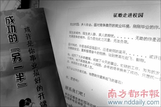下午4時,記者再次登錄深大校園網(wǎng),發(fā)現(xiàn)征婚帖子已被人刪除。隨后,記者亮明身份再次聯(lián)系該公司,一位負責人表示,這次活動是專門針對大學里的大四畢業(yè)生的,印刷了2000份宣傳單,聘請了學校里的大學生兼職發(fā)放,并在校園論壇上發(fā)帖子,宣傳單和帖子都表達得很含蓄。該負責人稱,之所以有這樣的想法,是因為有認識的朋友想找剛畢業(yè)的大學生,喜歡大學生“經(jīng)歷少、不復雜”,而公司了解情況發(fā)現(xiàn),不少大學生也想趁年輕時早點解決個人問題,找經(jīng)濟條件好一點的對象。雙方都有需求,于是她計劃在6月底7月初大學生畢業(yè)的時候搞一場交友活動。有不少電話咨詢,但還沒有人報名。
