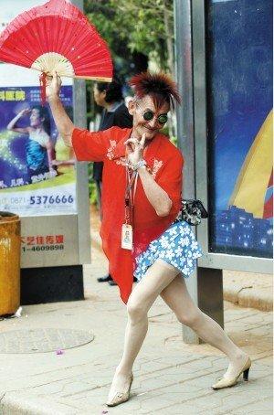 時髦的尖高跟鞋、絲襪、超短裙、艷麗的襯衫、酒紅色的“雞冠頭”……前天中午,在人流、車流如織的小菜園立交橋,這位時髦的“美女”大幅度搖擺著臀部,以妖艷的姿態(tài)橫掃著眾人的眼球。而當看清“美女”的正面時,大家的眼珠子差點掉了一地——原來,這位“美女”竟是一位老倌。