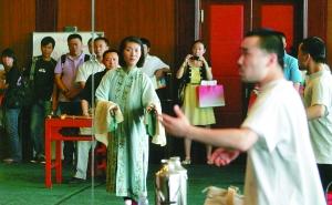 昨日,國家京劇院的排練館里,6名演員在參觀者面前認(rèn)真對(duì)戲。隔壁,一名女演員“表演”著化妝、穿戴,準(zhǔn)備唱一出“天女散花”,這些幕后工作平時(shí)并不對(duì)外開放。