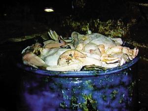 日前,南海當(dāng)?shù)卣鶕?jù)記者提供的線索,執(zhí)法搗毀了多個(gè)死鵝、死鴨加工點(diǎn)。在記者暗訪過(guò)的一個(gè)位于荒地和臭水溝旁的窩點(diǎn),執(zhí)法部門發(fā)現(xiàn)了堆放在桶里和冰柜里的上百只死家禽,有的已腐爛發(fā)臭。用來(lái)給死家禽脫毛的瀝青不知反復(fù)使用了多久,臭味很重。據(jù)查,每天僅這個(gè)作坊加工、販賣的問(wèn)題家禽就有四五百只。