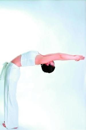 這是瑜伽中的“拱橋”動(dòng)作,對(duì)久坐者的腰椎很有好處,難度也比較大。沒(méi)有瑜伽基礎(chǔ)的人可以簡(jiǎn)化動(dòng)作: 先仰臥,腿微屈,用手肘把身體支撐成一個(gè)拱形。