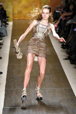 沒有什么比T臺上模特摔個仰面朝天更能引人注目。這不,荷芙妮格(Herve Leger)品牌發(fā)布會就收獲了這種極具眼球效應的意外,不止一次。短短幾分鐘之內(nèi),兩個模特相繼在貓步前行中摔倒在T臺上。
