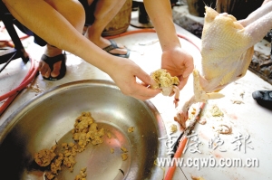 昨上午,四家經(jīng)營戶之一、在興隆街經(jīng)營了12年活雞鴨生意的劉德彬(化名)說,近兩年,自貴州運(yùn)來自稱是“土雞”,出現(xiàn)一種怪現(xiàn)象:雞胃被灌了一種“飼料”——用石粉攪成糊狀,再加幾粒玉米!斑@種雞每只比正常喂養(yǎng)雞至少重0.25公斤以上……我實在看不下去了,幾經(jīng)考慮才說出這個秘密!