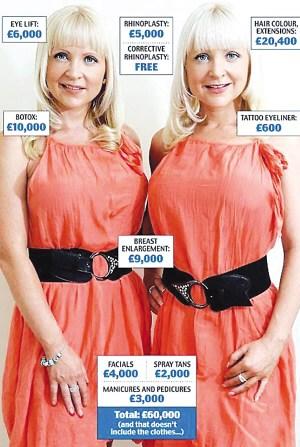 21歲那年,喬決定去做隆鼻手術(shù)。凱莉自然也不甘落后,于是照樣學樣。凱莉表示:“我們痛恨任何長相上的差異,所以我們不得不一同去做整容手術(shù)!26歲那年,為了“熨平“額頭上的第一道皺紋,姐妹倆雙雙開始定期注射肉毒素。2004年姐妹倆29歲那年,雙雙找到同一位整形醫(yī)生,各花4500英鎊接受了隆胸手術(shù)。有趣的是,由于姐妹倆長得形如“克隆人”,主刀醫(yī)生為了防止“串戶”,手術(shù)前不得不在她們各自的腹部上記上名字。這對孿生姐妹花迄今已經(jīng)共同接受了不下6次美容手術(shù),總耗資超過6萬英鎊。姐妹倆表示,她們無論做什么手術(shù),都將指定同一位醫(yī)生,以便讓她們永遠“難以分辨”。(宗 文)