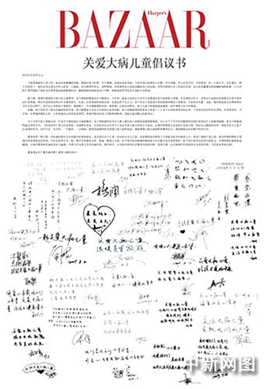 中新網(wǎng)8月10日電 今日,時(shí)尚雜志《時(shí)尚芭莎》攜手百位明星、名流和企業(yè)家發(fā)起聯(lián)名倡議,呼吁政府相關(guān)部門(mén)、各級(jí)慈善公益組織,共同關(guān)注中國(guó)大病兒童這一弱勢(shì)群體的生存、救助問(wèn)題。同時(shí),《時(shí)尚芭莎》宣布將于9月底在京舉行,本屆活動(dòng)募集的所有善款都將全部捐助給國(guó)內(nèi)大病兒童救助公益事業(yè),以此慈善盛舉向偉大祖國(guó)六十華誕獻(xiàn)禮。