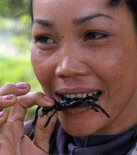 現(xiàn)在柬埔寨人用毒蜘蛛作佳肴宴請客人是常事了。去年記者到一處深山農(nóng)場采訪。農(nóng)場主人特地吩咐做油炸毒蜘蛛。為了不辜負(fù)主人盛情,我壯膽拿起蜘蛛,蘸著椒鹽、檸檬汁吃進(jìn)嘴里,味道還不錯(cuò),有點(diǎn)像油炸蠶蛹的味道,F(xiàn)在來金邊的旅游者,不少人特地到街頭的市場上品嘗這種“蜘蛛小吃”。當(dāng)?shù)剞r(nóng)民也因此多了一條生財(cái)?shù)穆纷印?