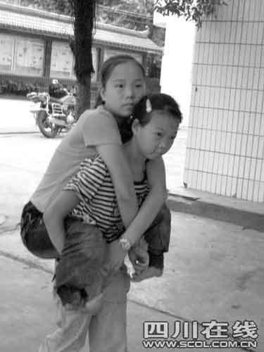 昨日上午第三節(jié)課下課鈴聲一響,初三一班的王琴就趕緊跑出教室,來到初三三班教室,走到姐姐王利面前:“姐,走,我背你上廁所!逼渌瑢W(xué)主動(dòng)騰開位置,只見瘦小的王琴蹲下半個(gè)身子,微胖的姐姐王利努力將雙手放在妹妹的雙肩上,妹妹用雙手托起姐姐的兩只大腿,然后甩開了大步。