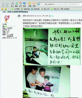 “我的戰(zhàn)友叫陳金春……三級(jí)士官轉(zhuǎn)業(yè),現(xiàn)在他的小孩被……診斷為‘急性淋巴細(xì)胞白血病’希望得到愛心人士的幫助!苯衲9月6日,戰(zhàn)友在某網(wǎng)站論壇上為陳金春女兒發(fā)出求助帖。不少網(wǎng)友打電話咨詢情況,并郵寄財(cái)物幫助小飛月。