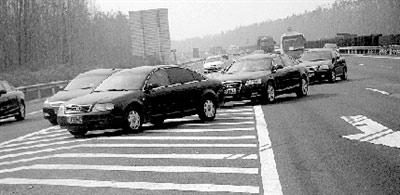 10時(shí)30分許,在京港澳高速公路695公里東半幅,18輛清一色的奧迪轎車一字排開向北行進(jìn)。突然,領(lǐng)頭轎車踩起剎車,從行車道兜到超車道上,隨即向右猛拐。它身后一長(zhǎng)串轎車也接連紛紛拐彎,形成約30米長(zhǎng)的半圓形,東半幅公路立即被堵死。此時(shí),車隊(duì)身后300米范圍內(nèi)至少有4輛大卡車和轎車,剎車聲立即響成一片。