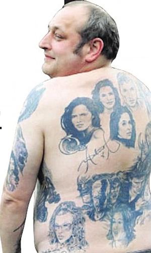 據(jù)英國媒體9日報道,英國41歲男子斯蒂夫·波特(右圖)堪稱是一名“超級追星族”,在過去10來年中,他將自己最喜愛的24名歐美影星和搖滾歌星的頭像都文在了自己的前胸、后背、臂膀以及大腿上。其中的12個明星還在波特的身體皮膚上留下了各自的親筆簽名。每當一個明星用筆在波特的皮膚上簽名后,波特就會立即趕往一個文身藝術(shù)家的工作室中,請文身藝術(shù)家將他最新得到的名人簽名也永久性地文在他的皮膚上。據(jù)悉,波特目前計劃申請吉尼斯世界紀錄。
