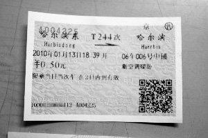 倪先生說,日前,他在論壇看到有人說能買到這么便宜的火車票,覺得很好奇,就去了家門口的一家火車售票點(diǎn),買到了5毛錢的硬臥火車票,外加5塊錢手續(xù)費(fèi),“那個(gè)賣票的小伙子都震驚了,他都不知道有這么便宜的票!蹦呦壬@兩站之間有八九公里,坐公交車按照當(dāng)?shù)貎r(jià)格得一塊錢吧!庇浾呖吹,這是一張1月13日哈爾濱東開往哈爾濱的T244次新空調(diào)硬臥中鋪票,價(jià)格處印著“0.5元”。倪先生說,他買這張票只為收藏,不會(huì)真的去乘坐。