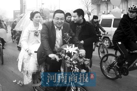 昨日,河南滎陽(yáng)市民王順強(qiáng)用120輛自行車舉行了一個(gè)別開生面的自行車婚禮。