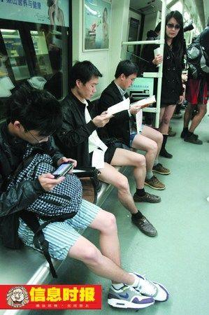 昨日中午12點左右,從廣州二號線萬勝圍站開出的地鐵車廂里,20多名只穿短褲,露出大腿的青年男女旁若無人地翻閱報紙或看書,此舉引來很多乘客的關(guān)注。據(jù)稱,這群年輕人是想借此宣傳環(huán)保,提倡低碳生活。