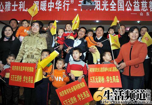雅士利集團(tuán)山東營業(yè)部經(jīng)理馬紅兵表示:雅士利一直以來,將公益活動(dòng)當(dāng)作自己的使命,當(dāng)作一項(xiàng)偉大的事業(yè),盡心盡力地做好它。希冀以此來回報(bào)社會(huì)多年來對(duì)雅士利品牌的信任和厚愛!雅士利人從扶貧救災(zāi),到修橋造路;從文化體育,到醫(yī)療衛(wèi)生的公益道路上永不停步,多形式向社會(huì)捐款捐資超4000萬元。雅士利將通過這項(xiàng)千萬陽光工程,并和山東省慈善總會(huì)合作,捐贈(zèng)價(jià)值50萬元的奶粉一批,對(duì)邊遠(yuǎn)地區(qū)弱勢(shì)群體,對(duì)兒童的健康和教育給予特別關(guān)愛,希望繼續(xù)將“愛心”與“溫暖”灑向齊魯大地。