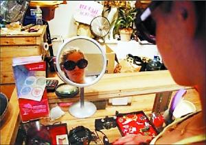 紐約的二手商店,一位女士正在試戴太陽(yáng)眼鏡。為省錢(qián),人們?cè)絹?lái)越樂(lè)意購(gòu)買(mǎi)二手商品。