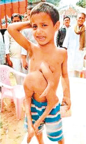 據(jù)德國《圖片報》2月19日報道,現(xiàn)年8歲的迪帕克·庫馬爾是一名來自印度比哈爾邦的小男孩。從一出生,他的外貌就把周圍的人驚得目瞪口呆:他長著4條腿和3支手臂,在他腹中有個孿生弟弟和他一起來到這個世界上。