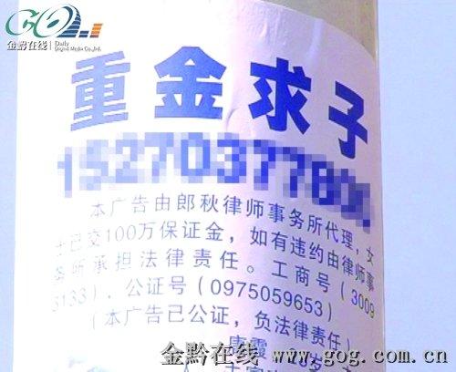 這幾天,在都勻市區(qū)主要街道的電桿上和小區(qū)廣告欄上,都有一張附帶相片的“重金求子”的廣告。公安人員在抓獲張貼者進行審訊后,提醒廣大市民這種廣告除了電話號碼是真的外,其他的一切都是假的,謹(jǐn)防上當(dāng)。