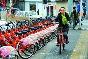 昨日,五號線東四站C口,首批拿到誠信卡的市民體驗免費試騎自行車。本報記者 薛珺 攝