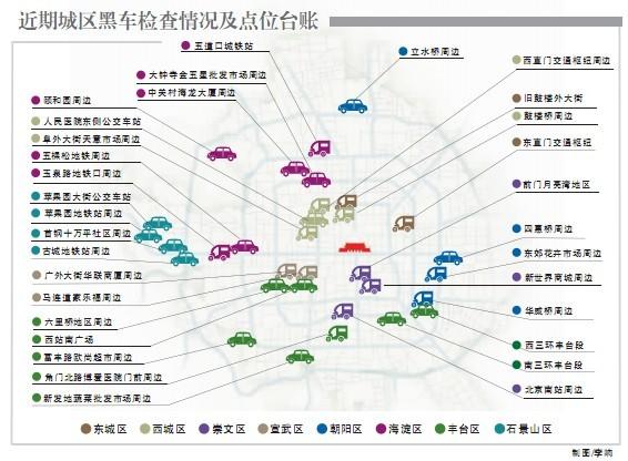另外,記者仔細(xì)研究“黑車地圖”后發(fā)現(xiàn),城八區(qū)的各大交通樞紐地帶,無疑是黑車聚集最嚴(yán)重的區(qū)域。其中,在西直門交通樞紐周邊,大約有5輛趴活“黑車”全天集中在西直門地鐵東北出口和西直門交通樞紐大廈南側(cè)便道,問題較為突出。而西站南廣場、五棵松地鐵、五道口城鐵站、大鐘寺城鐵站和玉泉路地鐵口,也都在早晚高峰時(shí)段活躍著各種違法運(yùn)營的小轎車、摩托車和三輪摩托。