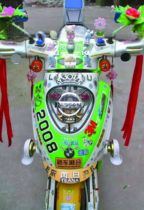 這輛電瓶車(chē)不得了,看車(chē)頭:寶馬、標(biāo)致、日產(chǎn)、東風(fēng)各種標(biāo)致全貼上了,還有可愛(ài)的helllo kitty 、snoopy等小掛飾,更加“致命”的是兩個(gè)反光鏡上還綁著兩朵大紅塑料花,就一輛電瓶車(chē)而言,可謂“風(fēng)騷”到了極點(diǎn)。