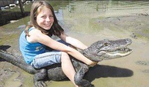 據(jù)悉,“科羅拉多州短吻鱷爬蟲動物公園”中目前養(yǎng)有350來條鱷魚,其中許多鱷魚都長達2.4米、重達270多公斤。雖然短吻鱷是自然界中完美的“殺戮機器”,但這些200多公斤重的兇猛鱷魚在薩曼莎手下就如同是溫馴的“寵物”!9歲的薩曼莎不僅常向游客們表演赤手空拳馴服鱷魚的驚人本領(lǐng),甚至連美國海軍陸戰(zhàn)隊士兵也慕名而來向她“拜師”學習如何馴服鱷魚的“藝術(shù)”!