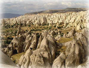 卡帕多奇亞位于土耳其安那托利亞(Anatolia)的腹地,在歷史上有很長一段時間與世隔絕,不通音信。在這里,自然的偉大力量鍛造出了世上獨一無二的神奇地貌。這種地貌的形成起源于幾百萬年前Erciyes、Hasandag和Golludag三座火山的噴發(fā)。噴出的大量巖漿冷卻、鈣化,凝固成的風化巖層具有良好的可塑性,易于受腐蝕。之后,較耐腐蝕的玄武質(zhì)火山巖覆蓋了松軟的風化巖層。隨著時光的流逝,玄武質(zhì)巖石碎裂,變得疏松,將松軟的風化巖重又暴露出來。慢慢地,除了被玄武巖象傘一樣遮蓋起來的地方外,雨水把風化巖石侵蝕出一條條溝壑,形成了陡峭的神奇煙囪景觀(fairy chimneys)。