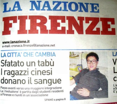 意大利主流媒體民族報(bào)(LA NAZIONE)在中國(guó)留學(xué)生無(wú)償獻(xiàn)血后,在頭版顯要位置率先發(fā)表意大利媒體界資深著名評(píng)論員喬瓦尼-斯帕諾的文章,文章以“一項(xiàng)禁忌被打破,中國(guó)人開(kāi)始獻(xiàn)血,”來(lái)稱頌中國(guó)留學(xué)生為意大利社會(huì)所做出的貢獻(xiàn),稱贊中國(guó)留學(xué)生為華人社會(huì)帶了一個(gè)好頭。喬瓦尼在文章中說(shuō),本次中國(guó)留學(xué)生的獻(xiàn)血活動(dòng),象征著華人向融入意大利主流社會(huì)邁進(jìn)了一大步,并且是特別有意義的一大步。
