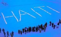 這次祝福祈愿燭火會是由國際大學(xué)的留學(xué)生會組織的。大家在校園內(nèi)的一塊空曠的雪地上用點(diǎn)燃的蠟燭拼寫出一個大大的“HAITI”,并一起為在海地大地震中遭遇不幸的人們祈禱祝福,追悼亡靈。